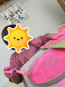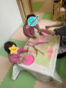 ピンクの絵の具をお手々にヌリヌリして、木が描かれた模造紙にペタペタ😊